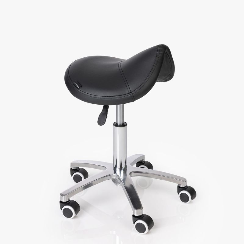 Banco Ergómico em sela com rodas anti-risco e base em alumínio. Conforto, mobilidade e uma postura correta para profissionais de saúde e bem-estar.