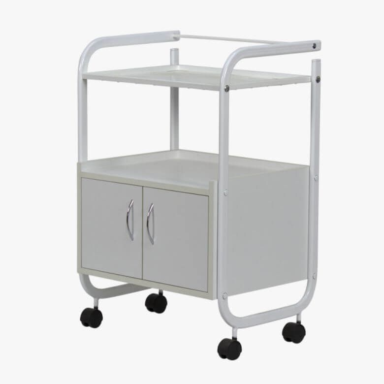 O carrinho auxiliar para estética Basic 2 é composto por uma estrutura metálica, na parte inferior encontramos um pequeno armário com 2 portas, para guardar acessórios de trabalho e pequenos utensílios, bem como 2 prateleiras na parte superior com rebordo anti-queda. Possui 4 rodas para facilitar sua movimentação durante os tratamentos em salões de beleza ou cabeleireiro.