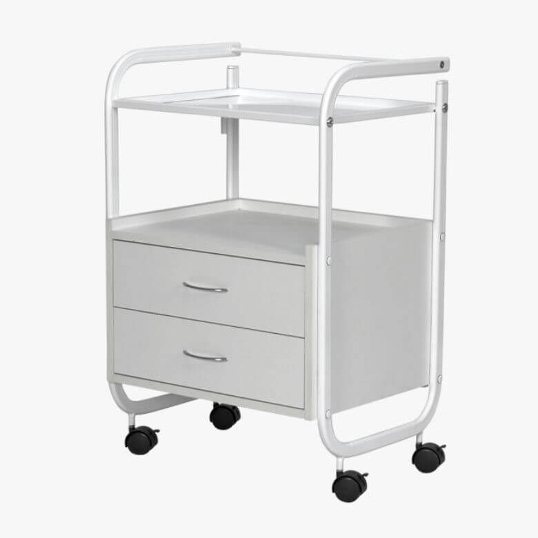 O Carrinho Auxiliar Basic 3 é constituído por uma estrutura metálica, na parte inferior encontramos duas gavetas, para guardar acessórios de trabalho e pequenos utensílios, bem como 2 prateleiras na parte superior com rebordo anti-queda.