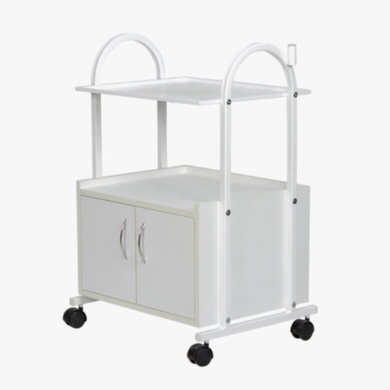 Este carrinho auxiliar para estética é constituído por uma estrutura metálica arredondada, na parte inferior encontramos um pequeno armário com 2 portas, para guardar acessórios de trabalho e pequenos utensílios, bem como 2 prateleiras na parte superior com rebordo anti-queda. Possui 4 rodas para facilitar sua movimentação durante os tratamentos em centros de estética ou cabeleireiro.