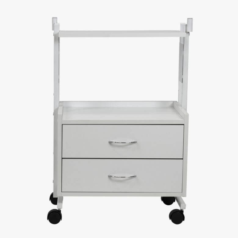 Este carrinho de estética é formado por uma estrutura metálica, na parte inferior encontramos duas gavetas, para guardar acessórios de trabalho e pequenos utensílios. Possuí 2 prateleiras, a prateleira mais inferior com uma rebordo anti-queda e a prateleira superior mais estreita, para colocar pequenos objetos. Dispõe de 4 rodas para facilitar o seu deslocamento durante os tratamentos de beleza.